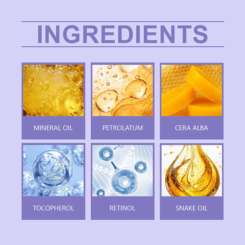 Key Ingredients: Mineral Oil, Petrolatum, Cera Alba (Beeswax), Tocopherol (Vitamin E), Retinol, Snake Oil